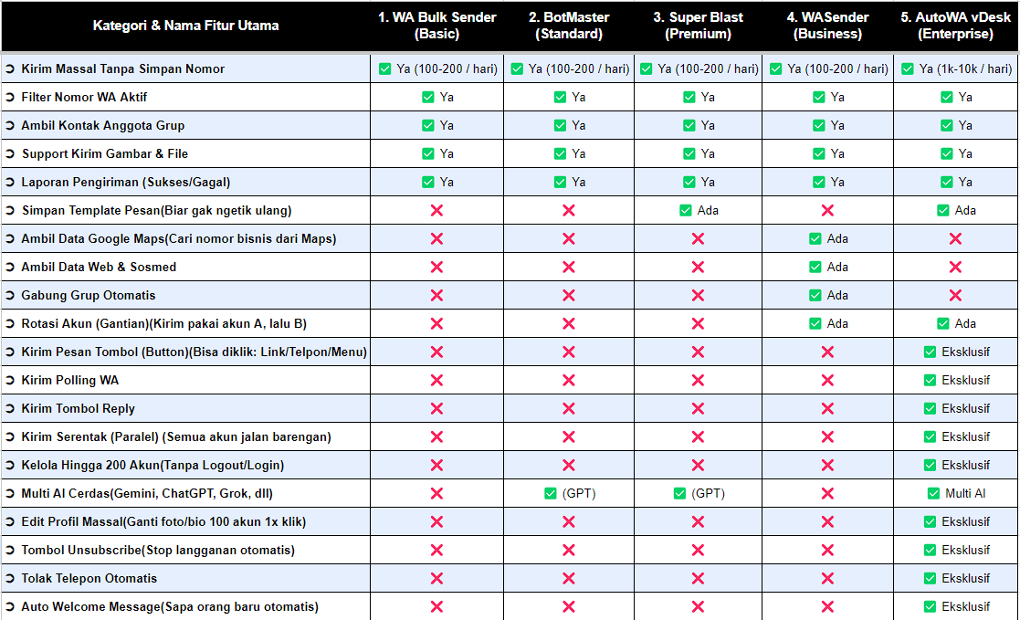 Cocok untuk: Bisnis berkembang yang membutuhkan interaksi otomatis, pemanas akun (warming up) agar aman, dan integrasi kecerdasan buatan.