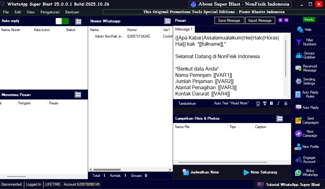 Kirim Jenis Pesan Teks, Media Gambar dan Video yang menyatu dengan teks (caption) hingga, Audio, dan Dokumen (Word/Excel). - ☑️ Personalisasi Pesan Canggih: