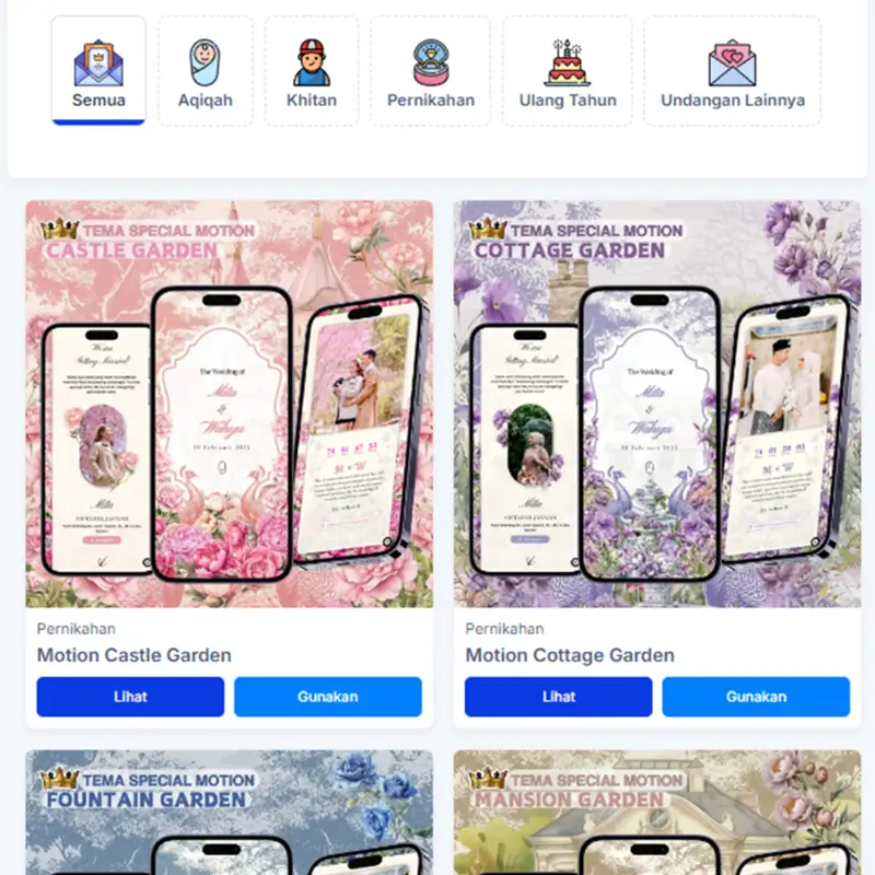Tersedia berbagai kategori acara seperti Wedding, Ultah, Khitan, Aqiqah, dan lainnya dengan desain eksklusif, modern, dan kekinian. Semua sudah siap pakai dan langsung bisa dijual!